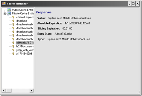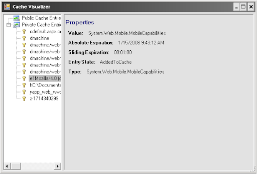 A new feature "Visualizers" was introduced with Visual Studio 2005 which allows an user to interrogate the objects in a user friendly manner during debugging. "Cache Visualizer" is a great tool written by "Brett Johnson" which allows you to see objects cached in ASP.Net cache under public and private nodes.